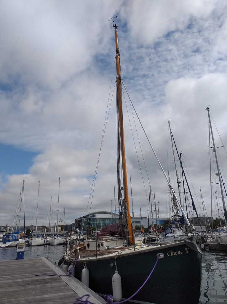 After what has seemed like a long wait, Chione’s new mast was finally stepped by Allspars at Queen Anne’s Battery Marina on Tuesday 5 July. The new mast has been manufactured by Collars and I am very grateful to the Team there for fitting all of the mast furniture and lighting wiring. Once the mast was delivered to Plymouth, Martin and I spent a weekend dressing it ready for stepping.