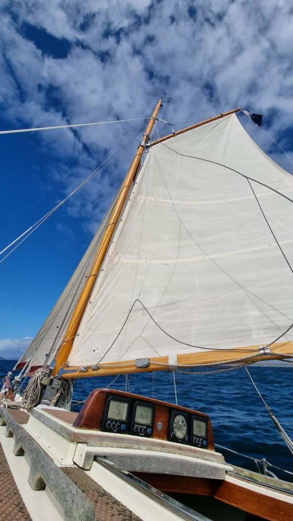 The wind was quite gusty and the swell suitably ‘rolley’ to make for an enjoyable sail! Chione sailed well and now that the jib halyard has been un-twisted (I had reeved it back to front, so David and Martin hauled me up the mast prior to sailing to rectify it. The Solent Bosun’s Chair worked well and felt very safe – it was attached to the throat and peak halyards which made it relatively easy to haul me up the mast).