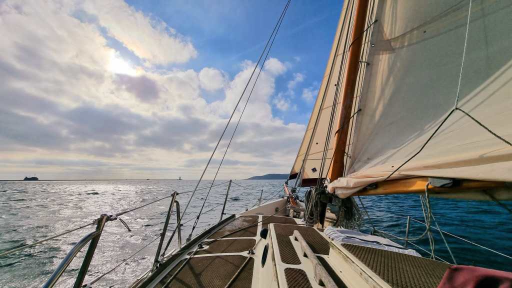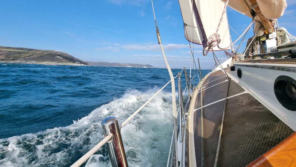 Wind SE force 3 – 5, sea state slight to moderate and good visibility all resulted in an exhilarating sail out past Penlee Point and back to King Point Marina. On the way out we spotted one of the (unidentified) Daring Class destroyers anchored off Cawsand and on the way back, HMS Somerset followed us in towards the breakwater.